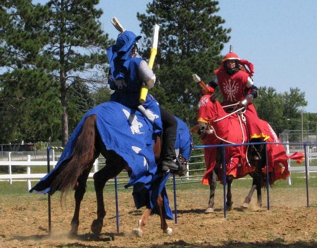 Besides just looking medieval, there are many equestrian games to play in the SCA. The one demonstrated here is called Ring Tilting. Sword drills, horseback archery, spear throwing, jousting the quintain, mounted combat and jousting other riders are other games that are commonly played. Most SCA games are based on historical military drills for skill development or common period activities. They are modified to keep safety a priority.