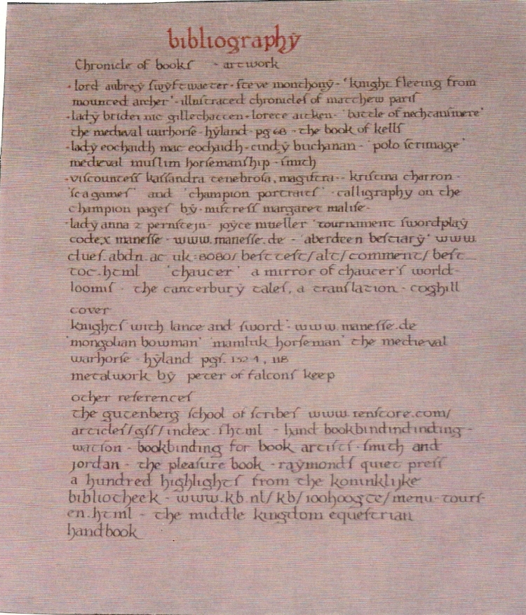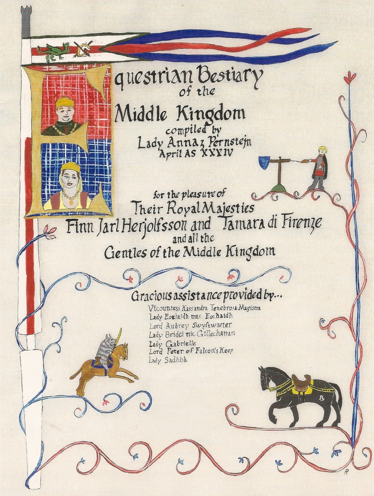 As I pondered my task, I felt compelled to accomplish it in a period manner, after all, we were trying to recreate the middle ages. With the help of my friend and mentor, Kassandra, and a number of other wonderful artisans, we compiled a real medieval book. The great part of belonging in the SCA is you are presented with numerous opportunities to learn something new. I already had skills as a leatherworker, but in the making of the Beastiary I also learned how to do bookbinding, calligraphy, illumination, about book styles and types, and found lots of new references to historical horse artwork. The original book is part of the Middle Kingdom regalia. Here for your enjoyment is a copy of the book.