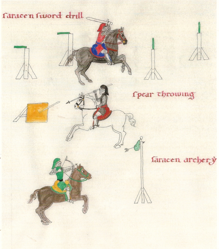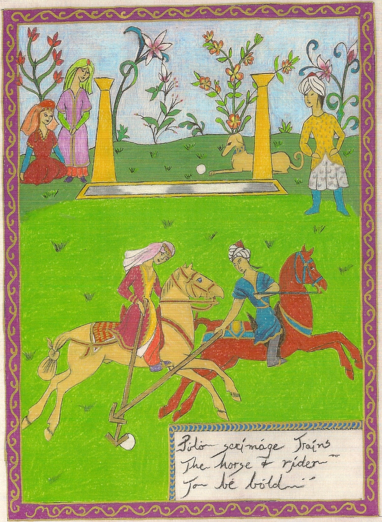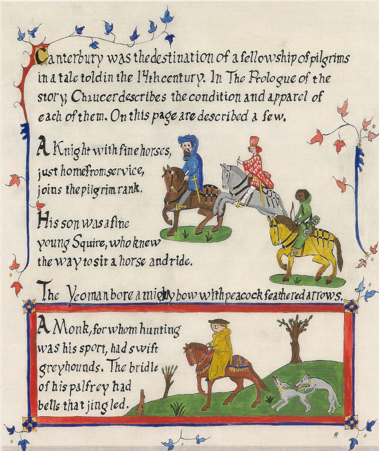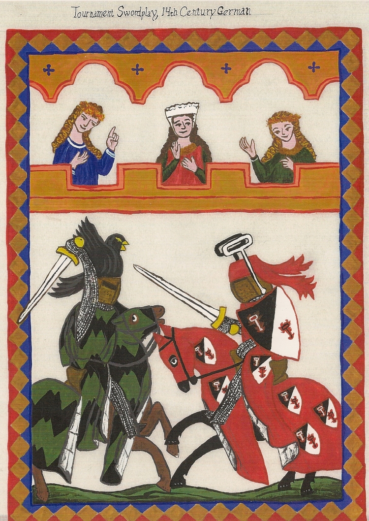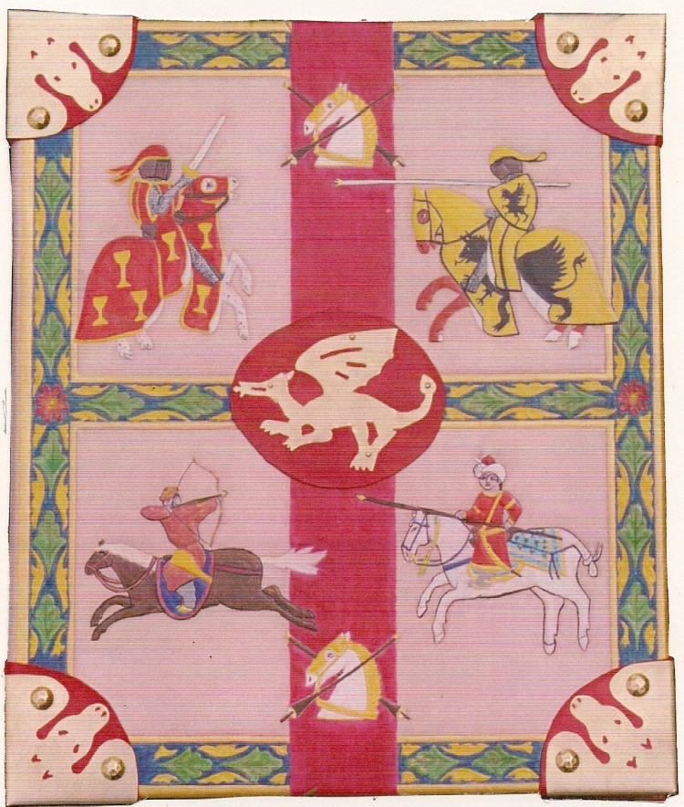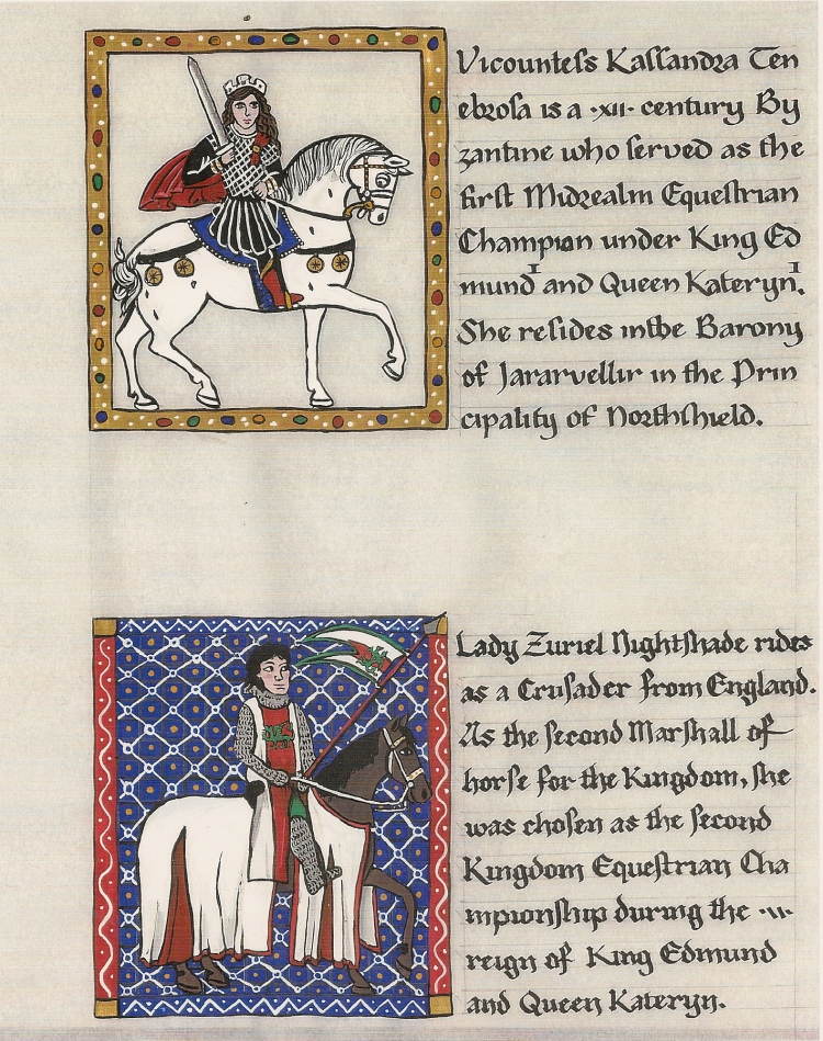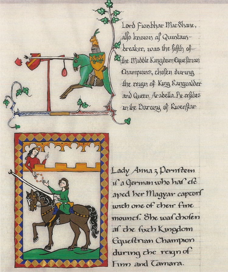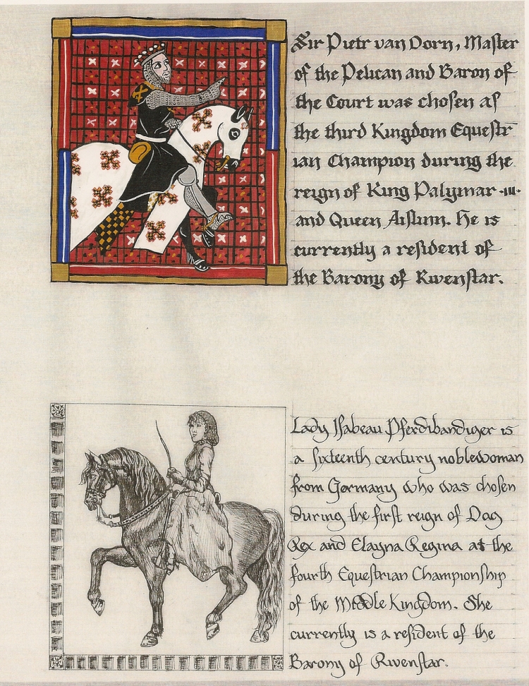 Besides giving the title and artisan names, the title page has numerous illustrations filling empty areas, just as many period illuminators would have done. Here are the third and fourth champions. The artwork on the champion pages reflects the time and culture the riders are portraying.