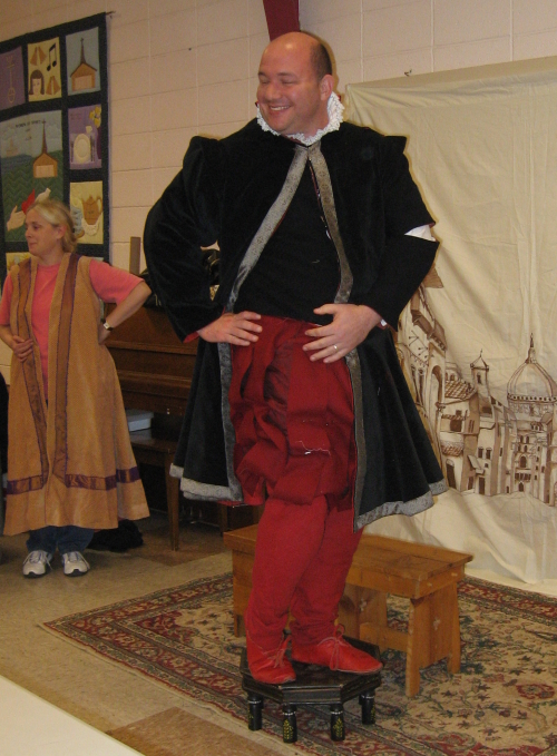 This outfit was from the 1500s. It has many layers to it and is thick enough to qualify as armor protection for rapier fighting. He certainly will look fancy swishing around the rapier list!