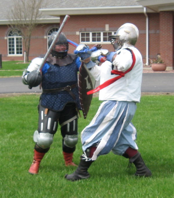 Armored Combat on the lawn, combatants at the ready, audience prepared.